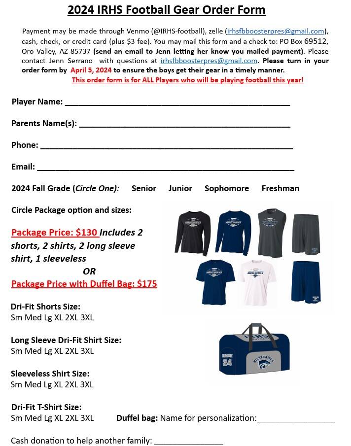 Orders will be submitted MAY 28th with no exceptions or late orders accepted. This is the 2nd and FINAL wave of gear orders. This is the FINAL opportunity to order player gear for the 2024 season
